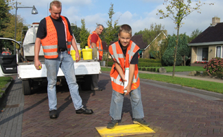 Vrijwilligers brandweer brengen markering aan.Zaterdag zijn de vrijwilligers van de Peizer brandweer bezig geweest met het weer duidelijk in zicht brengen van de brandputten in ons dorp. De putdeksel werden indien nodig blootgelegd en de pijlen op de doorgaande weg werden opnieuw met milieu vriendelijke verf duidelijk aangebracht. Of de jongste 'spuitgast' via de onlangs gehouden wervingsactie tot het korps is toegetreden is onbekend. Patrick Rooske druk doende met de markering |