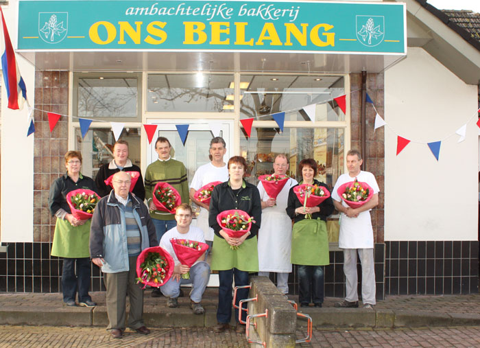 | Vrijdagochtend heeft het bestuur van de Coöperatieve Bakkerij 'Ons Belang' haar personeel gefeliciteerd met het honderd jarige bestaan. Het is vandaag 13 maart precies honderd jaar geleden dat de coöperatie ontstond. De personeelsleden werden door de bestuursleden verrast met een bloemetje en een enveloppe met inhoud. Vandaag is het dus een beetje feest voor het personeel, morgen wordt er middels een open dag van 10.00 - 14.00 een beetje gefeest met de Peizer bevolking. Het 'grote' dorpsfeest vindt plaats op 13 juni als de bakkerij een Groot Straatonbijt organiseert. |