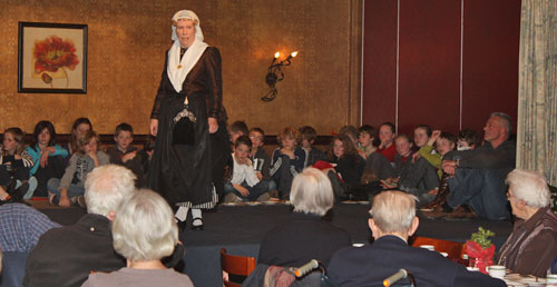 | Een lid van de Borgerder Wasschup toont kleding van vroeger aan de zaal en leerlingen van de Eskampe |