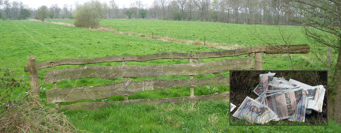 | Tijdens de paasdagen heeft, net als zoveel Peizenaren, de inzender van bovenstaande foto's een tochtje door de Peizer omgeving gemaakt. Het mooie landschappelijke hek aan de Wolddijk nodigde de man uit tot het nemen van de foto. Toen hij beter rond keek op de dam zag hij in de sloot een stapel door een bezorger gedumpte kranten. In dit geval ging het om exemplaren van de Groninger Gezinsbode maar helaas zijn er veel meer mensen die de natuur als dumpplaats gebruiken. De inzender van de foto's roept dan ook op om de natuur schoon te houden. |