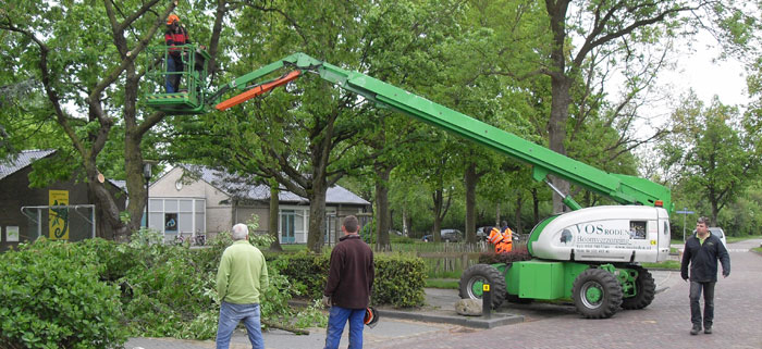 | Bij de Essen zijn donderdagmiddag een den, twee prunussen, een iep en een blauwe ceder door medewerkers van Vos boomverzorging gekapt. De bomen die met name op het veldje voor kinderopvang de Kameleon stonden verkeerden in een slechte staat. Om te voorkomen dat ze eventuele schade aan het gebouw of de omgeving zouden aanrichten is besloten ze te verwijderen. Aan de verleende kapvergunning is wel een herplantplicht gekoppeld. |