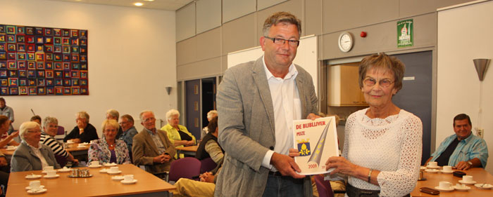 | Vrijdagmiddag was een heugelijke middag voor alle mensen die bij De Bijblijver betrokken zijn. Voor een zaal vol met allemaal vrijwilligers kreeg wethouder Wolters van het oudste redactielid, mevr. Jenny Rossink, het officiële eerste exemplaar van de honderdste Bijblijver. 'Voor historici dit exemplaar wordt dus in Nietap bewaard', aldus Wolters. De Bijblijver die ter gelegenheid van het 100ste nummer huis aan huis wordt verspreid valt normaal gesproken bij alle inwoners van de voormalige gemeente Peize die ouder zijn dan 60 jaar in de bus. In het blad komen tal van zaken aan de orde die de (oudere) bewoners van Peize informeren. Wolters noemde in zijn toespraak 'De Bijblijver het externe geheugen in de krantenbak'. Verder roemde hij de inzet van de vele vrijwilligers om dat De Bijblijver de verbinding tussen organisatoren en consumenten is. Hij besloot dat NOAD ook heir van toepassing is Nooit Ophol'n Altied Deurschriev'n. |