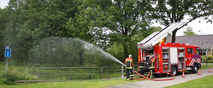 | Woensdagavond stond de spiksplinternieuwe tankautospuit van de brandweer Peize bij de Schipsloot. Sinds een week is de nieuwe TAS in Peize gestationeerd. Voordat met de nieuwe brandweerwagen uitgerukt kan worden dienen de pompbedienden zich voldoende te scholen in het gebruik van de nieuwe moderne pomp. Drie pompbedienden waren daarom woensdagavond drukdoende om zich te bekwamen in het gebruik. Begin juli zal de officiële overdracht van de wagen door de leverancier aan de gemeente plaatsvinden. |