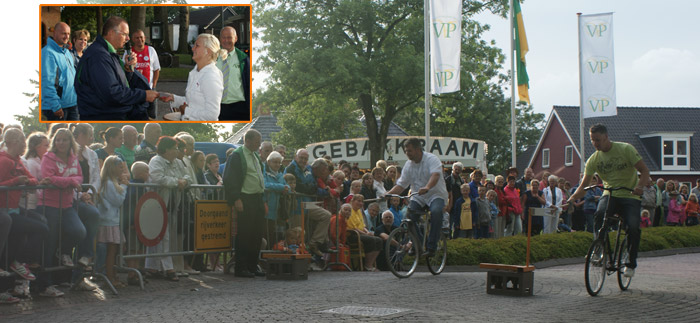 Het, mede door het mooi zomeravond weer, in grote getale opgekomen publiek kon genieten van een strijd die soms tot bijzondere evenwichtsstunts leidde. Aan het einde van de wedstrijd werd Chantal Hofkamp gecomplimenteerd met haar kwaliteiten door voorzitter Hagenauw van de VVP. Chantal (inzet) nam daarna als een echte kampioen de zoenen en daarbij behorende enveloppe in ontvangst. |
