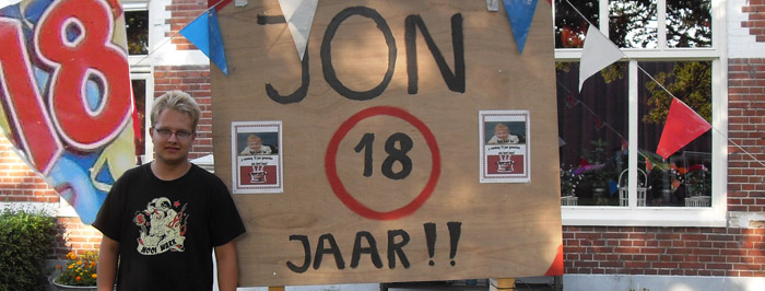 | Jon Geersing is donderdag achttien jaar geworden. Iedereen die door het dorp rijdt kan het niet ontgaan, want in de tuin staat een groot bord met de tekst Jon 18 jaar. Grote lol had de familie toen Jon vanmorgen in de tuin keek en het bord zag staan. Ook heel mooi vind Jon de posters die in het dorp hangen waarop staat dat hij groot ajax fan is. Als er iets in het dorp te doen is is Jon er meestal bij te kijken. Er ontgaat Jon niets, tijdens zijn folderloop houdt hij alles goed in de gaten. Komt u Jon vandaag tegen feliciteert u hem dan maar. |
