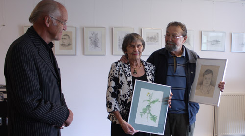 | Met een, op verzoek van Geert en Jenny, kleine bijeenkomst heeft de beheerscommissie van de Esrank donderdagmiddag aandacht besteed aan de expositie van de fam. Rossing. In de kleine zaal van de Esrank zijn tekeningen met portret afbeeldingen en gebouwen uit Peize van Geert en kunstwerken van Jenny Rossing te zien. De tekeningen van Geert zijn vooral bedoel, zoals Jenny omschreef, om Geerts kennis van historie, natuur en (Peizer) cultuur over te dragen. De kunstwerken van Jenny, die bestaan uit een samenstelling van gekalligrafeerde teksten en in aquarel opgebracht bloemranden, zijn voornamelijk bedoeld om schoonheid uit te dragen. De bloemranden worden gemaakt door bloemen uit eigen tuin als voorbeeld te rangschikken. De expositie is de rest van het jaar tijdens de opening van de Esrank te bewonderen, mits er geen activiteiten in de kleine zaal zijn, voor info 4065440. |
