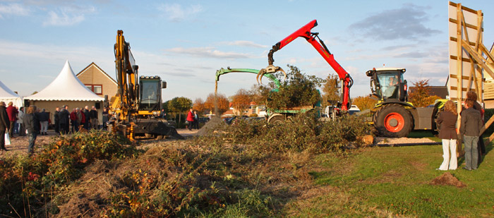 | Voor een kleine veertigtal genodigden en aanwezigen is de gemeente symbolisch gestart met het bouwrijp maken van Lange Streeken II. De wethouders Dam en Kemkers zorgden met enig mechanische hulp ervoor dat een boom verwerkt werd tot houtsnippers. Deze starthandeling volgde nadat beide heren hun verhaal hadden gedaan omtrent het tot stand komen van de bouwlocatie Lange Streeken II. Kemkers belichte de samenwerking tussen de gemeente en de werkgroep uit Peize waarin meerdere belangenverenigingen vertegenwoordigd waren. De familie Ebbinge werd in het bijzonder genoemd, omdat op het door hun familie zestig jaar lang bewerkt land Lange Streeken II met name gerealiseerd wordt. Wethouder Dam belicht nogmaals de duurzaamheidsinsteek die de gemeente bij het bouwen in dit project hanteert. |