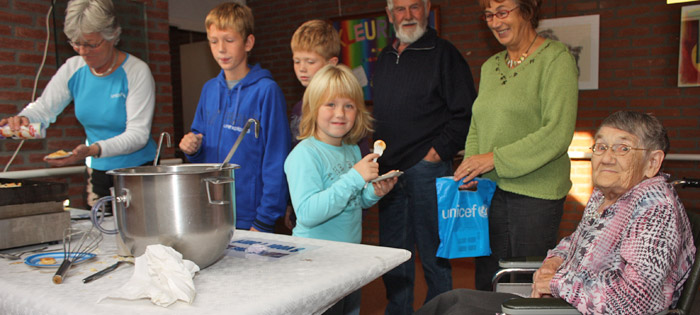 komst kringelde de geur van de Kniepertjes de bezoekers direct weer vertrouwd in de neus. Even verder in de centrale hal kon er gegrasduind worden in door vrijwilligers gemaakt textiel, tweedehands boeken en diverse huishoudelijke spulletjes. In de gang naar de recreatiezaal stonden diverse kraampjes. Bij de eerst konden met name de ouderen kennismaken met de Wii. Unicef had een stand met kaarten en voor jong en oud werden er poffertjes verkocht. Het rad van avontuur was weer opgesteld in de recreatiezaal. Menig bezoeker ging na afloop dan ook met een gewonnen flesje parfum, mooie tas of andere mooie prijs weer naar huis. De opbrengst van alle verkoopactiviteiten komt ten goede aan de Stichting Vrienden van De Hoprank. |