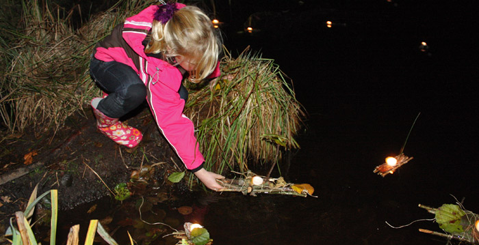 doekte tocht, heel eng als je niets kunt zien en dan door een greppeltje moet. Na een pauze met ranja en cake werd er van natuurlijke materialen een vlot/bootje gemaakt. De takjes en bladjes werden met een touwtje bijeengehouden en tenslotte werd er een waxinelichtje op geplaatst. Toen de schermer voldoende was ingetreden werden de lichtjes aangestoken en de bouwsels op de vijver in het bosplan losgelaten wat een sfeervol tafereel opleverde. |