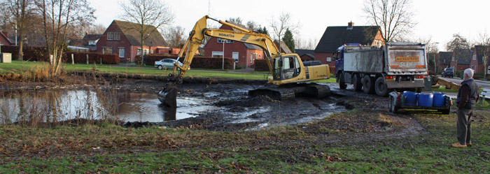 | Deze week is het bedrijf Vos uit Ruinerwold begonnen met het aanpakken van de vijver in Altena. Nadat men kon voorkomen dat via een overstort het water via het riool terug in de vijver stroomde is deze leeggepompt. Omwonenden en schooljeugd hebben er daarbij voor gezorgd dat een kleine 150 vissen werden gevangen en in een sloot werden uitgezet. Nadat het slib is verwijderd dat op de foto wordt bijeen geschraapt door het groot materieel zal worden begonnen met het opnieuw inrichten van de vijver. |