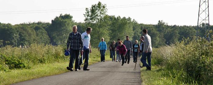 Op de nu nog bestaande Zuiddijk werpen de klootschieters richting De Horst tijdens hun
