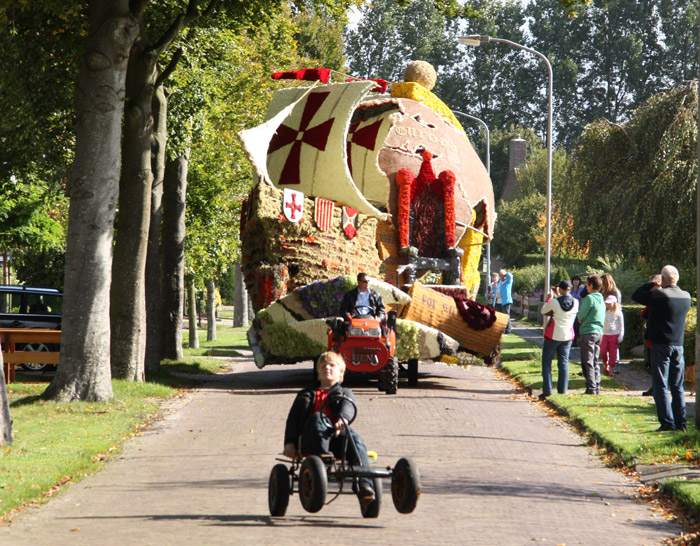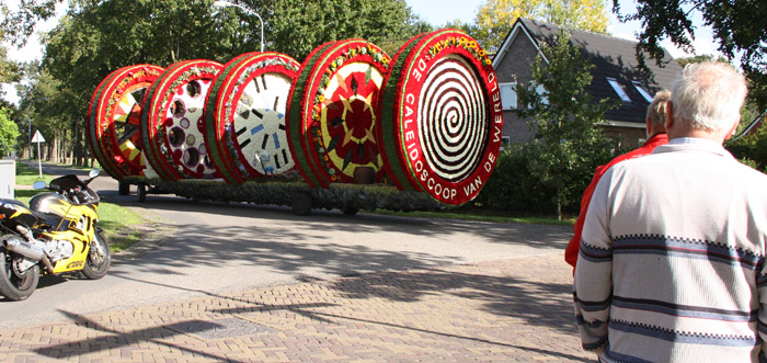 Zaterdagmorgen nadat de laatste hand aan de Rodermarktparadewagens was gelegd gingen de bouwgroep Altena en de Hopbouwers op weg van Altena naar Roden. Uitgezwaaid door de bewoners van Altena die duidelijk enthousiast waren over de wagens waar vele, vele,vele uren werk aan besteed is gingen de bouwgroepen vol goed moed naar Roden. Op de bovenste foto, trekt 'Het ei van Colombus' van de bouwgroep Altena door het dorp. Onder is 'De Caleidoscoop van de wereld' van de Hopbouwers te bewonderen.