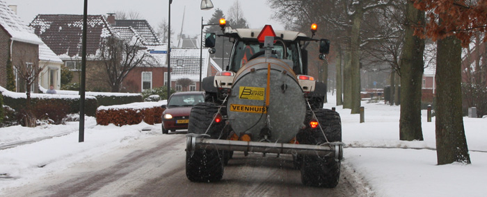 | Nu bijna al het strooizout uit Nederland is verdwenen, gaan de verschillende overheden op zoek naar alternatieven voor de gladheidsbestrijding. Maandagochtend zag DitisPeize.nl een tractor van de gemeente met een watertank over de Groningerweg rijden. Het sproeisysteem achter de tank gevuld met pekelwater zorgde ervoor dat de rijbaan gelijkmatig werd voorzien van pekel. Informatie op het internet leert dat pekelwater sneller werkt dan strooizout, maar het effect, gladheidsbestrijding, sneller verdwenen is (er moet dus vaker gereden worden). Een voordeel is dat pekelwater goedkoper te verkrijgen is (uit pekelwater wordt n.l. strooizout gewonnen), en pekelwater is voorradig. |