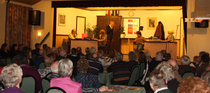 | De jubilerende toneelclub Altena staat vanaf vrijdagavond weer op de planken om in totaal zo'n zevenhonderd mensen te vermaken. Dit jaar doet de toneelclub dat met het blijspel ''Graag u en meneer''. Bij binnenkomst kregen de bezoekers een cadeautje waarvan voorzitter Richard Veurman voor aanvang de diepere betekenis verklaarde. In zijn openingswoord gaf hij aan blij te zijn met de verscheidenheid rond de toneelclub. Clubleden van het eerste uur in de zaal en in het spel werden benoemd ook de debutanten werden verwelkomd. 'De diversiteit treffen we gelukkig ook bij ons publiek', aldus Veurman. '4x volle bak en optreden voor de jeugd van Altena en de oudere jongeren in De Hoprank'. De bühnegordijnen waren vrijdagavond nog maar net geopend of de eerste lachsalvo's klonken al door het dorpshuis van Altena. |