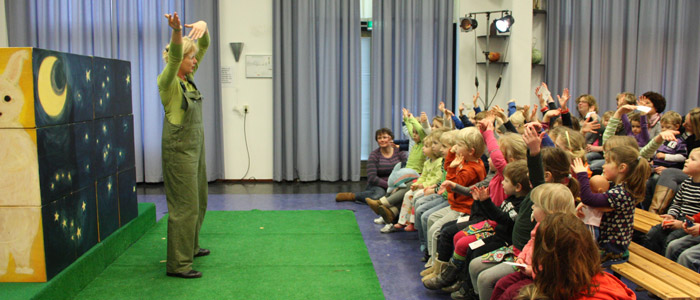 | Woensdagmiddag werden ongeveer veertig peuters en kleuters door konijn Quibus meegenomen door een kleurrijke kubussenlandschap. Door slim gebruik van de achterwand van kubussen werden er steeds verschillende landschappen op de achtergrond getoverd. Aan het begin van de voorstelling werd er met elkaar even geoefend hoe Quibus zijn lange oren kon gebruiken. Quibus ging met zijn vriendin poppenspeelster Magda van Veen op reis om te ontdekken dat de wereld groot is en niemand gelijk. |