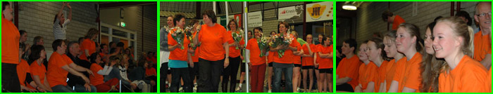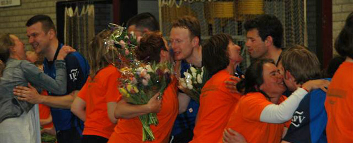 | Van de jubileumcommissie van de 50jarige volleybalvereniging kreeg DitisPeize.nl een verslag met foto's van het afgelopen zaterdag door de heren 1 van de volleybalvereniging behaalde kampioenschap. De wedstrijd zaterdag werd door vele bezoekers bekeken uitgedost in het oranje groen, de kleuren van het eerste tenue van de vijftig jarige. Een oranje wave in Peizer sporthal, Heren 1 kampioen! Afgelopen zaterdag was de laatste thuisspeeldag van een succesvol seizoen voor de jubilerende volleybalvereniging Peize. Maar liefst drie teams zijn dit jaar als kampioen geëindigd, en mogelijk kan Dames 3 via de nacompetitie ook nog promotie afdwingen. Peize Heren 1 werd kampioen van de derde divisie en deze zaterdag stond de laatste wedstrijd van het seizoen gepland tegen Sudosa (Assen), de nummer drie uit de competitie. Weliswaar was de druk al van de ketel omdat het kampioenschap reeds was veilig gesteld, desalniettemin wilde Peize het seizoen natuurlijk goed afsluiten, al was het maar voor het in groten getale aanwezige publiek gestoken in een knaloranje jubileum t-shirt. De eerste set werd met 26-24 gewonnen. In het vervolg van de wedstrijd werd de (service)druk behoorlijk opgevoerd, waardoor het eigen spel in steeds mindere mate kon worden verzorgd. De tweede set ging met 25-22 nog nipt verloren, maar de derde was Sudosa duidelijk agressiever en gretiger om te winnen, wat in een 2516 nederlaag resulteerde.