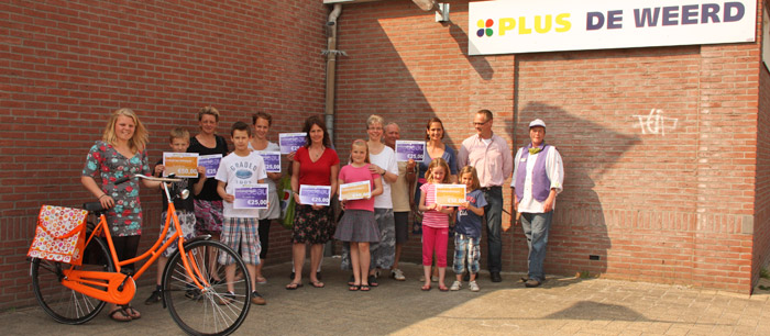 | Tien prijswinnaars kwamen vrijdagmiddag naar Plus de Weerd om hun prijs in ontvangst te nemen. De Plus Paashaas had vorige week 10 eieren in het dorp verstopt. Door een gevonden ei in te leveren kon men een prijs winnen, de volgorde van inleveren was bepalend voor de prijs. Zes gezinnen kregen van Plus bedrijfsleider Jan Gert en medewerkster Rennie een cadeaucheque van €25,-. Drie gezinnen kregen een ontbijtmandcheque t.w.v. € 50,-. De ontbijtmanden worden op 1e paasdag bij de families Tolhuis, Huberts en Bakker thuisbezorgd. Tenslotte kreeg Evelien Dijkstra de oranje Fanta fiets overhandigd, deze was door haar bij een Fanta actie gewonnen. |