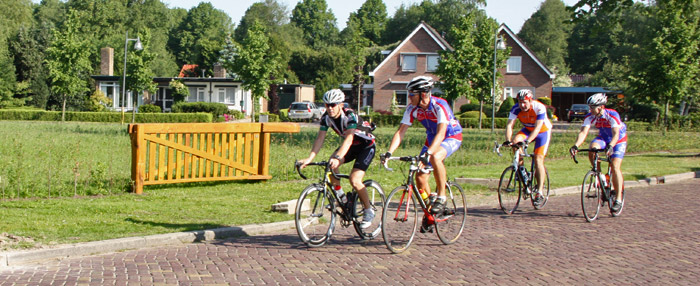 Deze deelnemers aan de Drentse Dorpentocht genieten van af de start van het prachtige fietsweer.