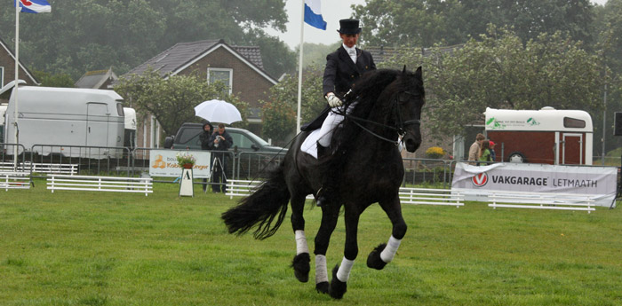 | Zondagmiddag is de tiende editie van de Paardenshow Peize onder druilerige omstandigheden gehouden. Na haar dressuurshow werd Laura Zwart door de organisatie uitgebreid bedankt. Laura heeft alle tien edities belangeloos met haar inbreng mede het succes van de Paardenshow bepaald. Op deze tiende editie verzorgde ze naast haar eigen dressuurshow een clinic. Nederlands reserve kampioen Nynke Letmaath op pony en Noordenvelds sportvrouw van het jaar Joanne Westerhof, die beide bij Laura trainen, gaven uitvoering aan de clinic. Zo'n vierhonderd bezoekers waren op het evenemententerrein aan de Brinkweg op het spectaculairste moment van de middag tijdens de demonstratie van The Thunderguys uit België. |