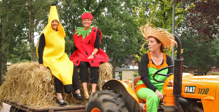 | Zaterdagochtend was er een groot probleem bij de peuterspeelschool aan de Esweg. Er was deze ochtend een groot pleinfeest georganiseerd, maar de sleutel van de toegangsdeur was verdwenen. Gelukkig kwamen Mattie Aardbei en Jeannet Banaan er aan en die bleken na enig zoeken de sleutel bij zich te hebben. Na dat de deur geopend was konden de peuters zich uitleven op onder meer de Groentebaan, het Wortelvangen en fruitraadspel. U begrijpt het thema van het peuterzomerfeest was dit jaar Groente en Fruit. In de afgelopen weken waren de peuters hier samen met de leidsters al druk mee bezig geweest en de producten die dit hadden opgeleverd konden vandaag door de ouders worden gekocht. Natuurlijk ontbraken de lootjes, het schminken en de springkussen niet op het feest. Klik voor de foto's |