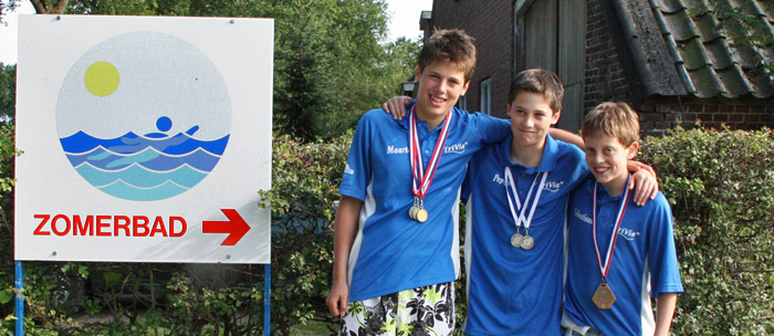 | Maarten, Pepijn en Sebastiaan de zoons van de familie Rottier van de Oude Velddijk hebben het zwemseizoen weer met medailles afgesloten. Sebastiaan heeft een bronzen medaille behaald, hij is als derde geëindigd op de 100meter vrije slag tijdens het Nederlands Kampioenschap (8-12 jarigen). Tijdens de rugslag zwom hij een 26 jaar oud Gronings record uit de boeken. Gronings omdat de drie jongens Rottier bij de Groningse Zwemclub Trivia zwemmen. Pepijn draagt twee zilveren medailles voor zijn resultaten op 100 meter school- en vrije slag. Dat het 's ochtends om half vijf 's opstaan om in Groningen te gaan trainen zijn vruchten afwerpt blijkt ook uit de resultaten van de oudste zoon Maarten. Hij heeft op zijn NK met zijn estafette team brons (4x 200m vrije slag) en zilver (4x 100m vrije slag) gehaald. Op de 4x 100m wisselslag zijn ze Nederlands kampioen geworden. Op zijn individuele afstanden zat hij bij de top 10 van het NK. |
