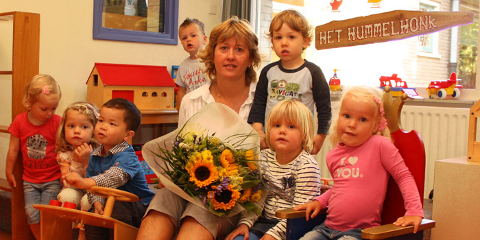 | Maandagochtend werd juf Jeannette van peuterspeelzaal Het Hummelhonk verrast door Mariëtte Deiman, coördinator van de Stichting Peuterspeelzalen in Noordenveld. Juf Jeannette was op 1 augustus namelijk 25 jaar peuterleidster in Peize. Op deze maandag, de 'eerste schooldag' van het nieuwe seizoen, werd ze met dit jubileum gefeliciteerd met een fraaie bos bloemen en een cadeau. Jeannette is, meer dan 25 jaar geleden, als vrijwilligster in de toen nog oude Centrumschool begonnen. Na wat omzwervingen door het dorp is Het Hummelhonk nu al geruime tijd in de Essen gehuisvest. Haar collega Mattie Hoekstra met wie ze al jaren het enthousiaste team van peuterspeelzaal Het Hummelhonk vormt en andere vrijwilligers kwamen haar ook feliciteren met het jubileum. |