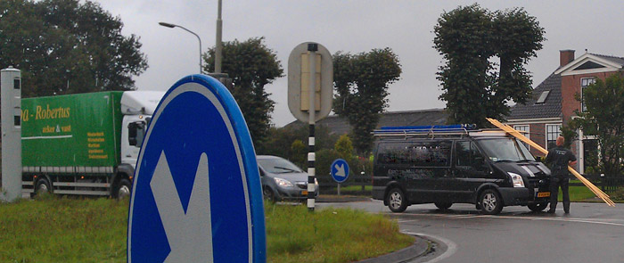 | Dat zal even schrikken geweest zijn voor de bestuurder van het busje. Op de rem voor het rode verkeerslicht richting Peize en dan in eens je pvc-buizen voor je uit zien vliegen. Gelukkig veroorzaakten de buizen geen hinder voor het overige verkeer en kon de bestuurder na zijn materialen beter vastgezet hebben zijn weg vervolgen. |
