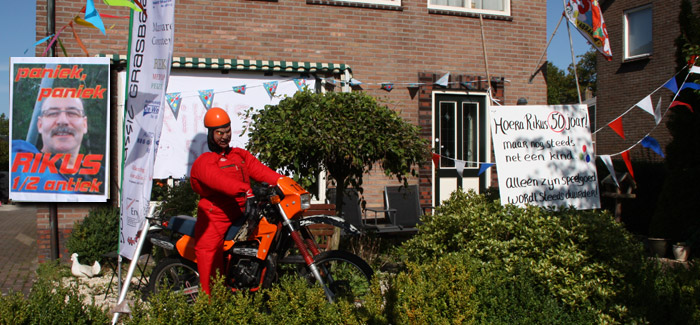 straat hadden zijn kameraden, 'de boy's from Paais', een illegale grasracebaan aangelegd. Ook het gezicht van Rikus is door hun door het dorp verspreid met de alarmerende kreet dat Rikus nu half antiek is. In de verder versierde tuin maken ze duidelijk dat Rikus ondanks zijn 50 jaar nog net een kind is met alleen een steeds duurder worden de hobby. Natuurlijk feliciteert DitisPeize.nl Rikus ook met zijn 50ste verjaardag. |
