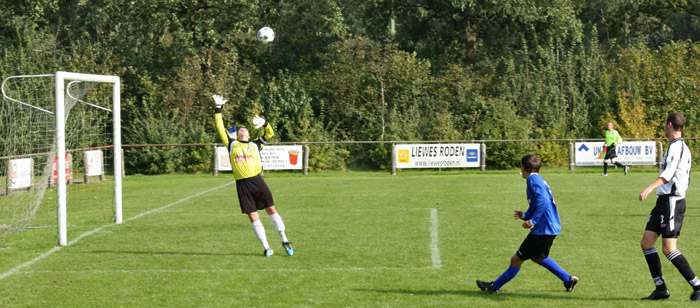 Met een mooie boogbal passeert Frank Darwinkel, de keeper van Drachten, de bal zal echter ook net over de lat gaan waardoor het opdat moment 1 - 0 blijft.
