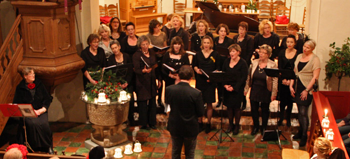 | Onder leiding van Jan Zwerver hebben de dames van close harmonykoor Femmes Cabales vrijdagavond in de Peizer kerk twee concerten verzorgd. Rode draad van het concert waren door Jannie van Zanten vertelde muzikale kerstverhalen. De dames zongen de verschillende nummers meerstemmig en begeleid op piano door Yvonne van Dongen maar ook a cappella. |