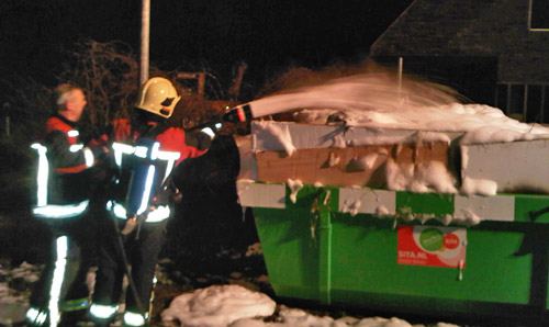 te blussen. De vuurhaard zat onderin de volgestopte container waardoor het blussen bemoeilijkt werd. Uiteindelijk besloot de brandweer met een laag schuim de container af te dekken waardoor het vuur gestikt werd. Na een half uur vertrokken de spuitgasten weer richting kazerne. De politie die ook ter plaatse is geweest is natuurlijk nieuwsgierig naar de dader van deze derde brand binnen vijf dagen in Peize. Mocht u informatie hebben meldt het dan op 0900-8844. |