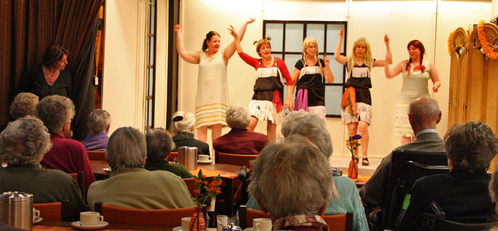 | Sandy Shaw, Cactus Cowboy, De Alpen Zusjes, K5 zomaar een greep uit de nationale en internationale artiesten die woensdagavond er voor zorgden dat in De Hoprank het dak eraf ging. Zo'n 70 bezoekers (bewoners, gasten en werkend personeel) genoten van de jaarlijkse Play-back show van het personeel. Spreekstalmeester Ria zorgde met haar kennisvragen 'Weet u wie het waren?' dat de tijd tussen de verschillende artiesten vlot overbrugd werd waardoor er een fijn tempo in de avond zat. Toen de vakantie hit van 2010 Tsjoe Tjoe Wa ingezet werd leek het er even op alsof er spontaan een polonaise door de zaal zou gaan. |