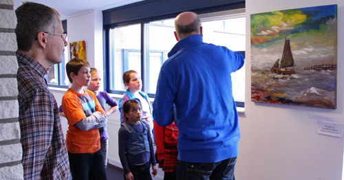 | Vrijdagmiddag zijn veertien kinderen onder leiding van Liesbeth Takken begonnen aan vier lessen schilderen. De lessen worden gegeven als activiteit van de ladder van de combinatie-functionarissen. Na de vier lessen zullen de gemaakte schilderijen op een echte tentoonstelling worden gepresenteerd. Om de kinderen een idee te geven van de mogelijkheden kregen ze als begin van de eerste les uitleg van een paar van de huidige exposanten in de Esrank. Momenteel hangen er bijvoorbeeld werken gemaakt door mensen met niet aangeboren hersenletsel. Op de foto luister mede-exposant Jörg Wekema hoe Elbert Jan Top de kinderen uitlegt hoe zijn schilderij 'Roerig water' tot stand is gekomen. |