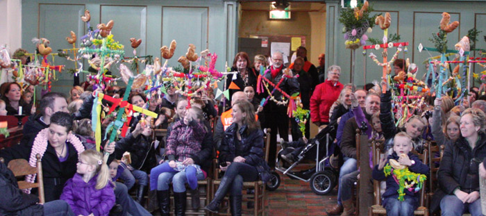 Ongeveer vijftig kinderen hebben tijdens de Palmpaasstok optocht hun mooi versierde palmpaasstok in het dorp laten zien. In tegenstelling tot eerdere editie werd zondag begonnen in de Peizer kerk. Voorganger Cris de Valk van de Oecumenische gemeente vertelde de kinderen over de betekenis van en de overeen-