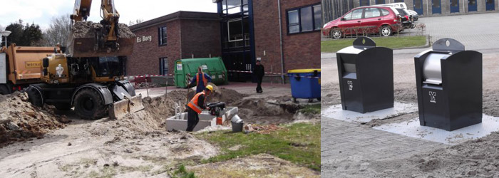| Al geruime tijd waren de vuilstortcontainers niet meer in gebruik. Door ondermeer stijgend grondwater voldeden de oude containers niet meer. Vrijdag zijn daarom nieuwe containers geplaatst. De ruim drie meter diepe betonnen bakken die al enige tijd in de berm van de Zuster Kleveringastraat klaar lagen zijn daarvoor eerst geplaatst. Nadat deze geplaatst waren zijn de stortkokers aangebracht. De bewoners van de Es Borg kunnen met hun afvalpas binnenkort weer hun huishoudelijke afval kwijt. (tipgever bedankt) |