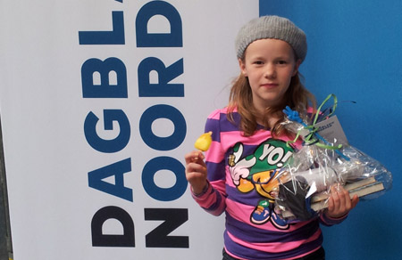 | Jente Vermeer heeft woensdag de 2e prijs gewonnen in de verhalenwedstrijd Dagblad van het Noorden in de categorie groep 7 en 8. Jente kreeg de prijs uitgereikt door kinderboeken schrijver Tjibbe Veldkamp. Rond het thema Olympische Spelen werden kinderen opgeroepen een origineel, ontroerend of spannend verhaal te schrijven. Jente heeft een verhaal geschreven over een meisje die bij het dragen van de fakkel met het Olympisch vuur struikelt waardoor het stadion in de fik vliegt. Gelukkig komt het meisje er goed van af en als klap op de vuurpijl ontstaat er een nieuwe Olympische sport waarbij zo snel mogelijk een brand moet worden geblust. |