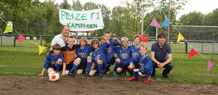 | Het F1 team van de voetbalvereniging Peize is zaterdag op het eigen veld kampioen geworden. De pupillen van trainer Niels Guchelaar en coaches Theo en Melle (niet op foto) hebben tot nu toe alle wedstrijden gewonnen en zijn door de concurentie niet meer in te halen. Zaterdag werd VEV '67 met 7-0 verslagen. De kampioenen,vlnr Mats, Jasper Tom,Jesse, Bo, Merijn, Ivo en Wiebe. Op de foto ontbreekt David. |