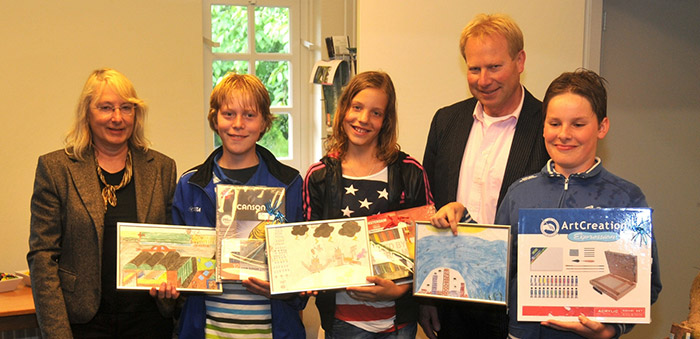 Uit de dertig prachtige tekeningen heeft een professionele jury drie prijswinnaars gekozen. Remco Smeenge 3e prijs, 2e prijs Sanne Wekema, 1e prijs Marc Wekema (vrnl op de foto) kregen de prijs uit handen van cultuurwethouder Oeds Keizer. Na een hapje (Treets) en een drankje (Cola/ Seven-Up). Werd de rest van de tentoonstelling bekeken, waarbij enkele kunstenaars uitleg gaven. De tekeningen en al de andere kunstwerken zijn nog 3 weken te bewonderen. |