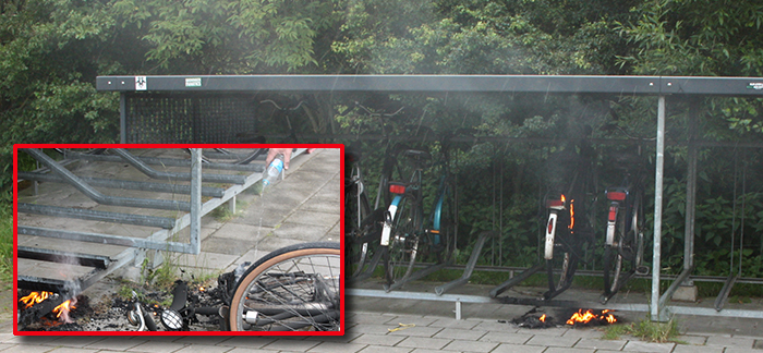 | Zaterdagochtend tegen acht uur zag een passerende automobilist dat er in de fietsenstalling bij de bushalte aan de ringweg een fiets in de brand stond. De fiets waar al weinig brandbaars meer aan te vinden was werd door omstanders uit het rek getrokken en met een flesje rioolwater geblust. Van de fiets die naast de brandende fiets stond was een trapper totaal weggesmolten. Voor zover bekend is dit de al de vijfde fiets