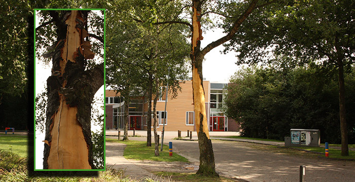 | Voor zover bekend heeft het noodweer van afgelopen nacht weinig schade aangericht in Peize. De buien trokken met veel bliksemschichten en donderslagen tussen half twee en half vier over Peize. In de loop van de dag bleek een boom aan de Boerakkerweg volledig door de bliksem getroffen te zijn. Bijna geheel ontdaan van zijn schors valt de boom behoorlijk op. Zoals op de inzet te zien is is de boom ook volledig gescheurd door de inslag. Vrijdag zal de boom door de gemeente gekapt gaan worden. |