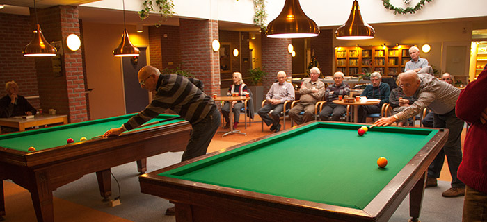 | Het waren allemaal kwieke oudere jongeren die donderdag de centrale hal van de Hoprank vulden. De heren speelden deze dag om de kampioenstitel van de biljartvereniging BVOG. In een spannende competitie kwamen uiteindelijk de heren Hofstee en Weijs als finalisten bovendrijven. In een spannende wedstrijd besliste Sjoert Weijs met prachtige caramboles de wedstrijd in zijn voordeel. Behalve de tweede prijs behaalde Hofstee ook nog de titel van meeste caramboles in één buurt namelijk 32. |