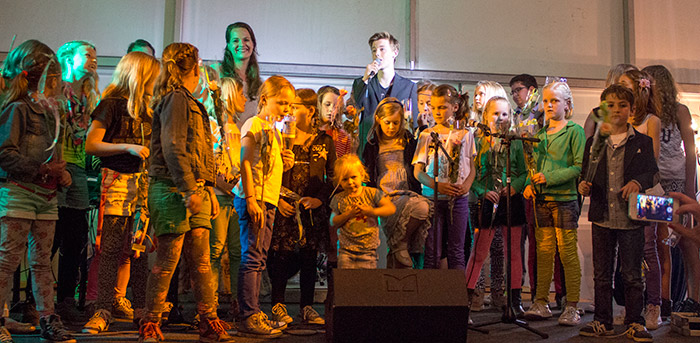 | Spetterend en spectaculair was zaterdagmiddag de opening van het Paiser Proms 2013. Kinderen getraind door Minka Zaal van het Stempalet gaven een geweldig optreden. De ruim tweehonderd bezoekers werden getrakteerd op bekende top 40 nummers afgewisseld door oude GTST songs en liedjes die dankzij kinderen voor kinderen bekendheid hadden gekregen. Begeleid op piano, geluidsband of de echte viermans band lieten de kinderen tot verbazing van velen hun soms gouden keeltjes klinken. Voor de artiesten die 's avonds op het programma staan wordt het nog een hele kluif om de door de kinderen geboden kwaliteit te over treffen. Helaas geen geluidopname, maar allen foto's achter deze link. |