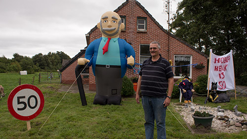 | De tuin was maandag mooi versierd op de Oostingslaan, Boerlaan kant moet je d'r tegenwoordig bij zeggen. De zijn leven lang aldaar wonende Henk Bebingh vierde zijn vijftigste verjaardag. 'Ach ja, je moet het maar over je heen laten gaan' zegt Henk gelaten. De kinderen en familie hebben dit natuurlijk gedaan zegt hij doelend op de grote Abraham en de ander verwijzingen in de tuin naar zijn vijftigste verjaardag. Henk weet niet wat ze deze dag nog verder in petto voor hem hebben, de medewerker van Novatec was vandaag misschien wel net zo lief, met zijn hobby de pony's en geiten, naar een grote markt geweest. |