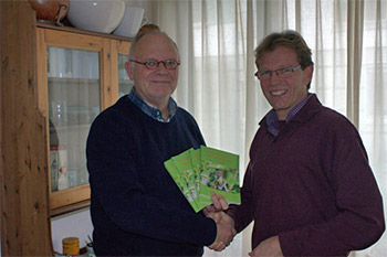 | Leefstijlcoach Dolf Flinker heeft een boekje "De 3-G-Methode voor Persoonlijke Groei" geschreven over hoe persoonlijke ontwikkeling invloed heeft op een gezonde leefstijl. Uit handen van Dick Prak van uitgeverij De Hondsrug Pers ontvingt Flinker (r) de eerste exemplaren. Flinker schetst een simpel rijtje: Stel: Je wilt je gezondheid verbeteren – meestal moet je dan ongezonde gewoontes veranderen – je gaat eerst informatie verzamelen – dan ga je aan de slag, al dan niet met hulp. Op het moment dat je bewust een aantal andere keuzes gaat maken ben je met Persoonlijke Groei bezig. Naast het schrijven organiseert leefstijlcoach Flinker iedere 3e dinsdag van de maand Gezond Verstand Avonden in Peize. Op deze avonden gaat het, om via gastsprekers informatie met betrekking tot een goede gezondheid, economie, voedsel en alle gebieden die hieraan gelieerd zijn te belichten.Via zijn website en op deze avonden is het 100 pagina's tellend boekje van Flinker aan te schaffen. |