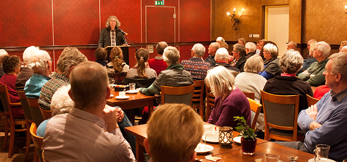 | Onverwacht druk was het donderdagavond in café Ensing bij de lezing georganiseerd door de Historische vereniging Pezie - Peize. Daar waar op ongeveer veertig bezoekers was gerekend bleken er zestig mensen te zijn toen directeur Dirk Mulder om acht uur het woord kreeg. Op een voor de toehoorders zeer prettige manier vertelde Mulder over het Kamp Westerbork tijdens en na de oorlog. Toen na de oorlog het Herinneringscentrum Kamp Westerbork werd opgericht was het vermoeden dat dit alleen in het begin interessant zou zijn. Mulder vertelde dat tot op de dag van vandaag het centrum in een behoefte voorziet om te vertellen over deze periode in onze recente geschiedenis. Na zijn bijna twee uur durende lezing was er voor de toehoorders ook nog de gelegenheid om met de heer Mulder in gesprek te gaan over het geen hij had verteld. De bezoekers vonden het een geslaagde avond van de Historische vereniging. |