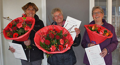 | De onlangs in Peize gehouden collecte voor de Hartstichting heeft dit jaar € 2.456,14 opgebracht. De Hartstichting bedankt haar vrijwilligers, collectanten en gevers van harte voor hun steun aan de Hartstichting. Bij het inleveren van de collectebussen werden een aantal dames verrast met een bos bloemen en een oorkonde omdat zij 25 en 35 jaar gecollecteerd hebben voor de Hartstichting. Op de foto vlnr Geesje Kuiper en Ineke Veltman voor 35 jaar collecteren en Cobie Meinema voor 25 jaar. |