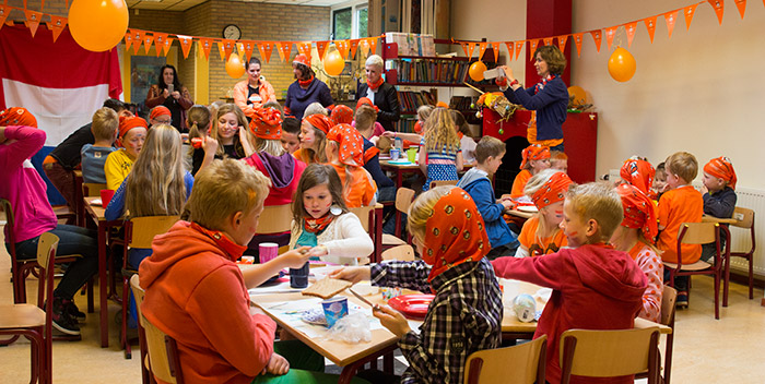 | 'Tja helaas kan het hier, maar het is wel gezellig', zegt een moeder als ter sprake komt dat de gehele Altenaschool samen in de hal kan ontbijten. Het helaas is vanwege de aanstaande sluiting in verband met het verminderend leerlingen aantal. Het Koningsontbijt vooraf aan de Koningsspelen op de basisscholen wordt door de bijna veertig leerlingen van o.b.s. Altena samen genuttigd. Je broodje zelf smeren en dan kiezen wat voor beleg je er op doet en ondertussen lekker met je vriend of vriendinnetje kletsen, ze vinden het top. 'Ze eten hier dus wel meer dan dat ze thuis doen', merkt een andere ouder op. Na het ontbijt wordt ook in Altena net als op alle andere scholen meegedaan aan het wereldrecord Kanga dansen. Na het dansen worden er 's ochtends nog drie leuke activiteiten als Koningsspelen gedaan. |