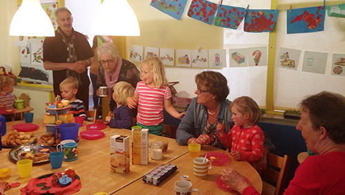 | Het was donderdag middag gezellig druk op kinderdagverblijf en bso de Kameleon. Vanaf half vier waren de opa en oma's van de kinderen uitgenodigd voor een high tea. Opa en oma konden zo op een gezellige manier een kijkje nemen op de creche. Maar liefst dertig opa en oma's waren gekomen. Zij genoten van de lekkernijen, die voor hun klaar stonden, maar vooral van hun kleinkinderen die in geuren en kleuren alles vertelden over de Kameleon! |