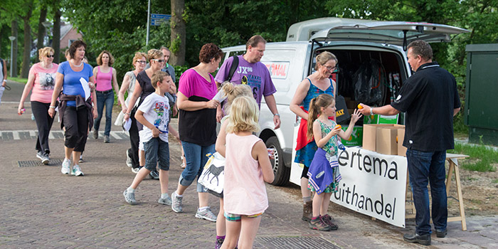 | De wandelaars die dachten zo even de ravitailleringspost op de Oude Velddijk voorbij te kunnen lopen kwamen donderdagavond bedrogen uit. De vierde route van de wandel4daagse, die in Peize 5 dagen duurt, werd in het zuiden van Peize verlopen. Om de tocht goed te kunnen volbrengen kregen de wandelaars al snel na de start een mandarijn van de organisatie aangeboden. Als een ware marktkoopman had Jannes voor elke loper een stimulerende opmerkingen, en zoals gezegd diegene die dacht zonder de heerlijke 'pitamientjes' de tocht te volbrengen werd duidelijk gemaakt dat ze echt iets lekkers misten. |