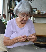 Hennie Bonder, aan de Pol haakt ontzettend graag rondjes. Hiervoor gebruikt zij oud naaimachinegaren. Na jarenlang hard werken voor haar gezin en tuin, is dit wat haar dagen vullen en kleurrijk maken.